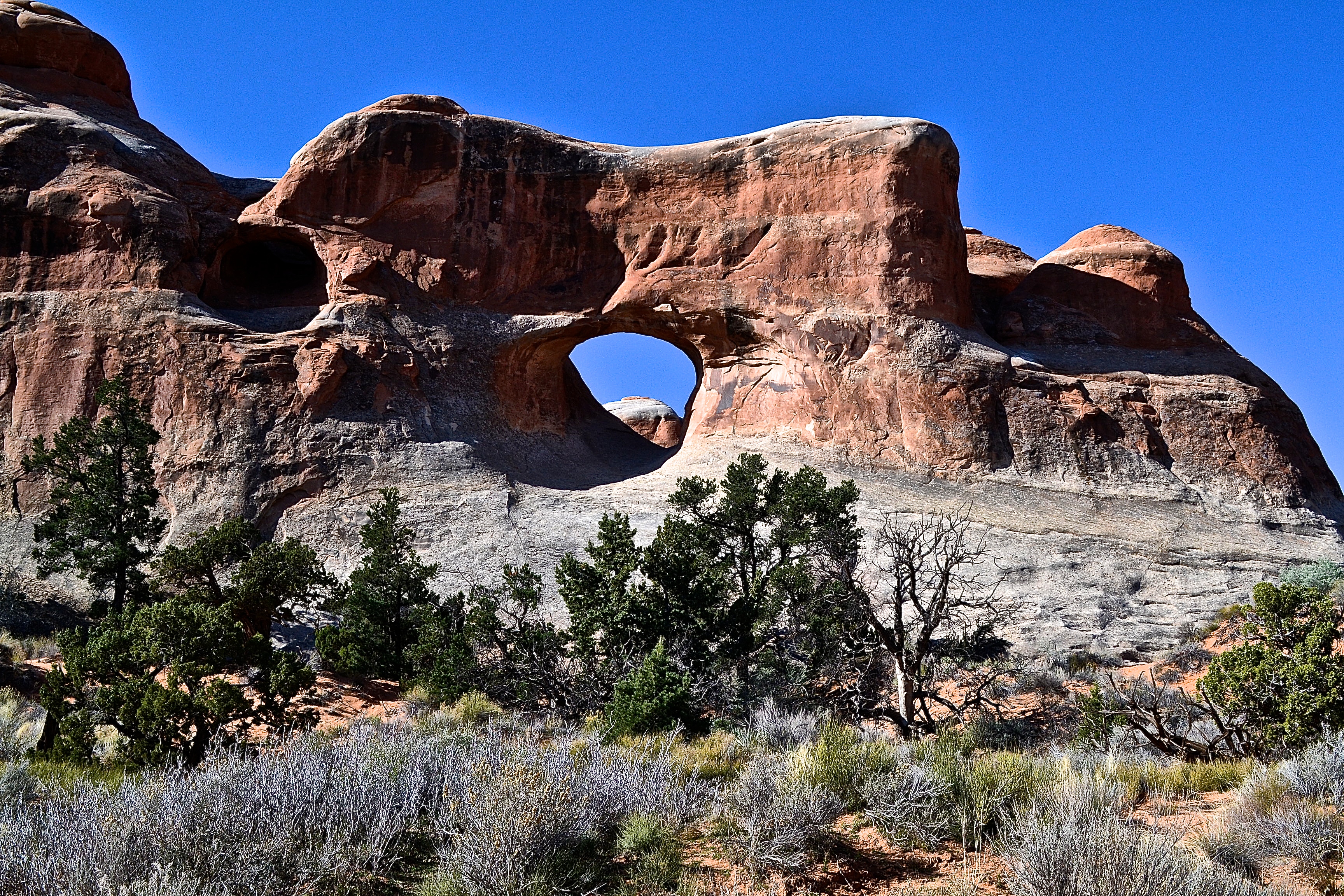 The Delicate Arch is perhaps the most famous arch and hike in the park and is popular with everyone. It is the most busy in the evening for sunset and fairly popular in the morning for sunrise. They park recommends not doing it during the day (especially in the summer) as it is insanely hot and you will get dehydrated fast. The park marks it as a difficult trail and states that you should bring at least one liter ow water with you because there truly is not shade anywhere after the sun is up. If you don’t wish to do this hike, but still want to see the arch, you can go to a viewpoint and take it in from the distance and comfort of you car. We arrived at Delicate Arch around 5:30 am and were the first people in the parking lot (which is small and fills up very fast). It is about a 20-30 minute drive from the entrance of the park, so I would plan the time accordingly. The stars were out and I was the only one out of my group with a headlamp, which is much-needed. It takes about an hour (maybe a little more depending on pace and fitness) to get to the arch. The path itself is almost all uphill with lots of steep incline, climbing on slabs of rock and near the end, a precarious walk on a small ledge before the arch reveals itself. It was very windy at the top (nothing delicate about that wind) and we hunkered down as we waited for sunrise. Groups of people slowly started arriving, but not too many. As we waited for the sun to rise, we just sat in silence taking it all in. Moab is beautiful at all times of the day with no bad angle or view. After watching the sunrise, we explored around, eventually making it past a canyon and onto the ledge of a cliff where we got another beautiful perspective of the arch. After eating breakfast, doing some yoga and enjoying the glory of the morning, we packed up and headed down. One of the best mornings I have had in a while and a memory I will hold onto for a while.