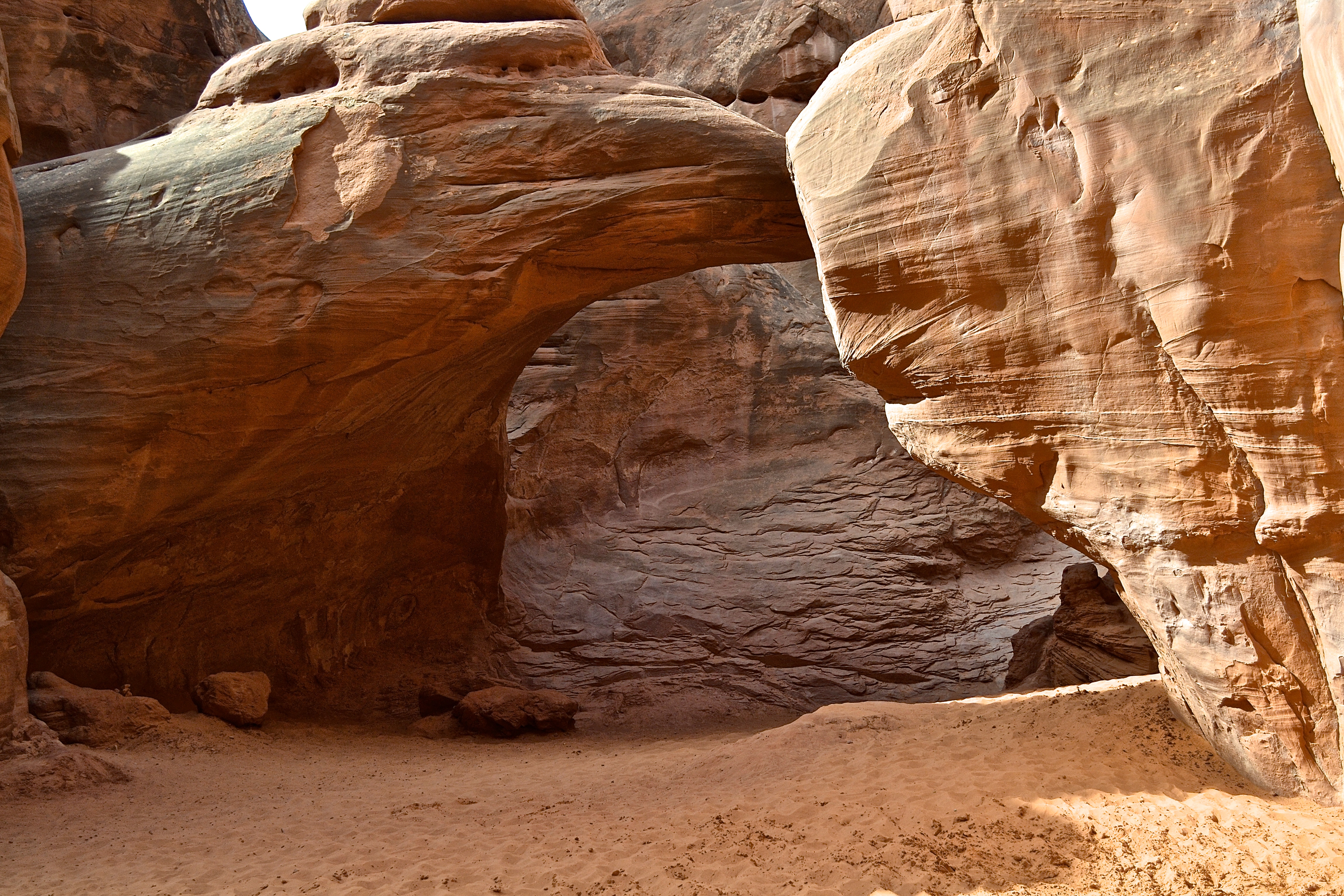 At the same stop, we also took the very short trek through a canyon to the Sand Dune Arch. It was a nice sandy spot in a canyon where families were building sand castles. I climbed (barefoot) through and up rocks to stop on top of the arch. There was no sign that said I couldn’t do that, but I used a lot of caution while doing so. I did come down with two bloody toes, but hey, it was worth it. I foresee in the future the park regulating the access to climbing as it will eventually take a toll on the rocks.