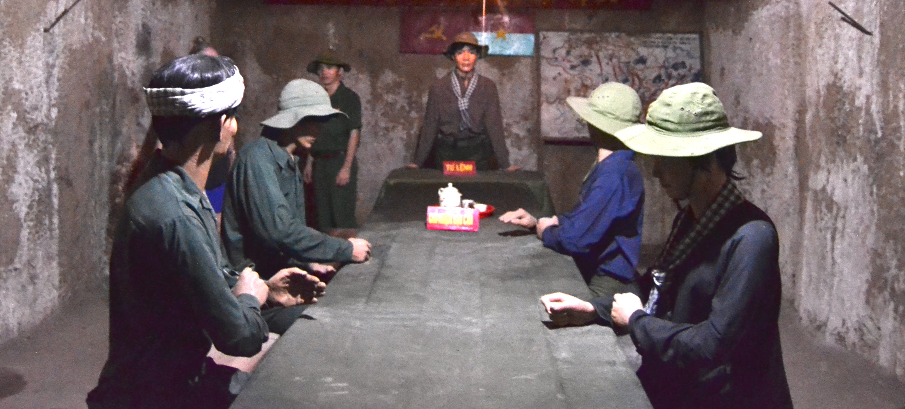 Eery model statues that depict one of the underground meeting rooms.