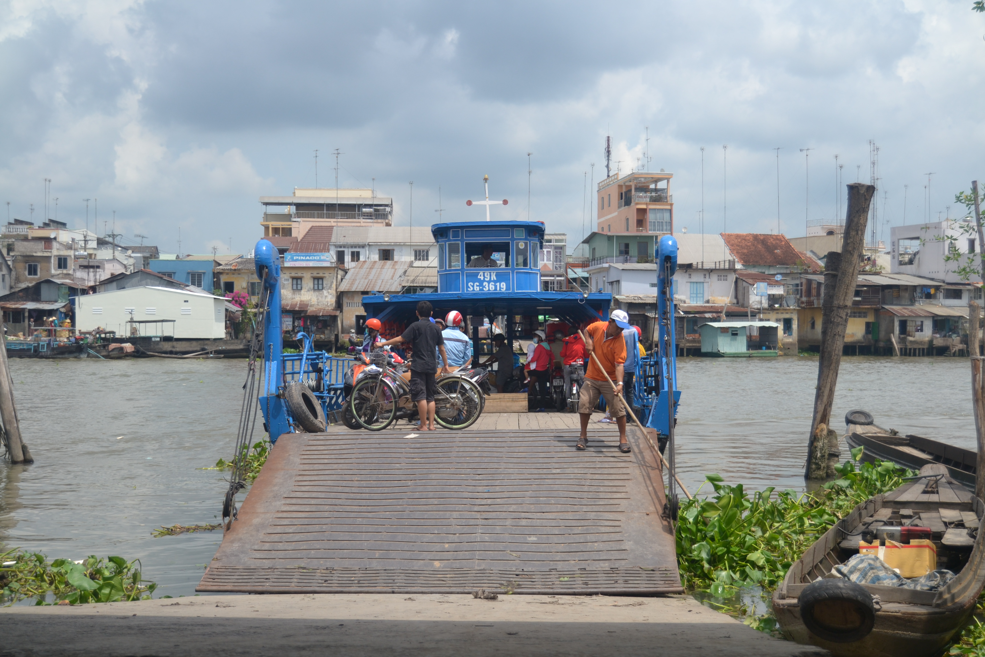 We all boarded this boat to transit to get to our riverboat; all mixed in the motorcycles and animals.