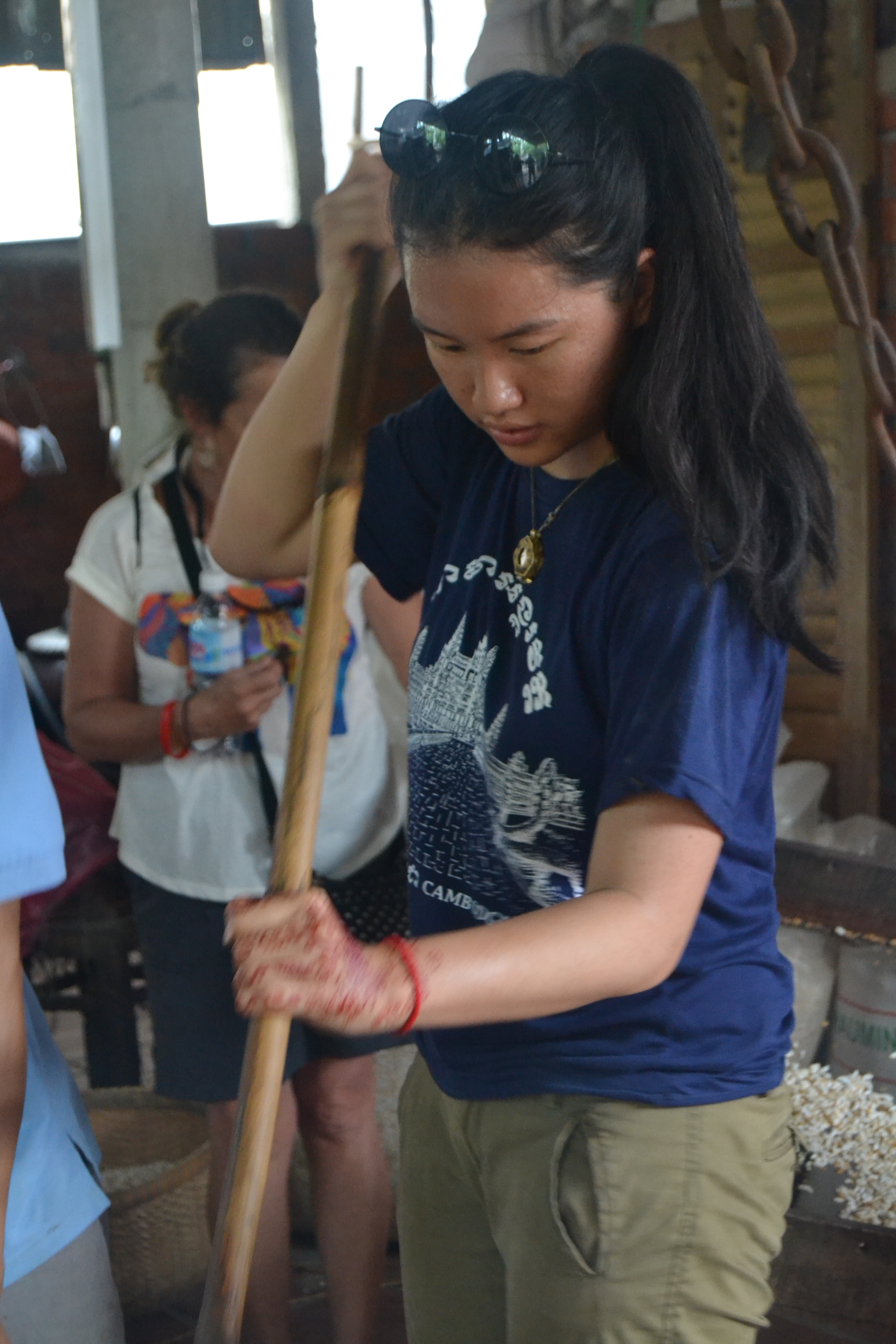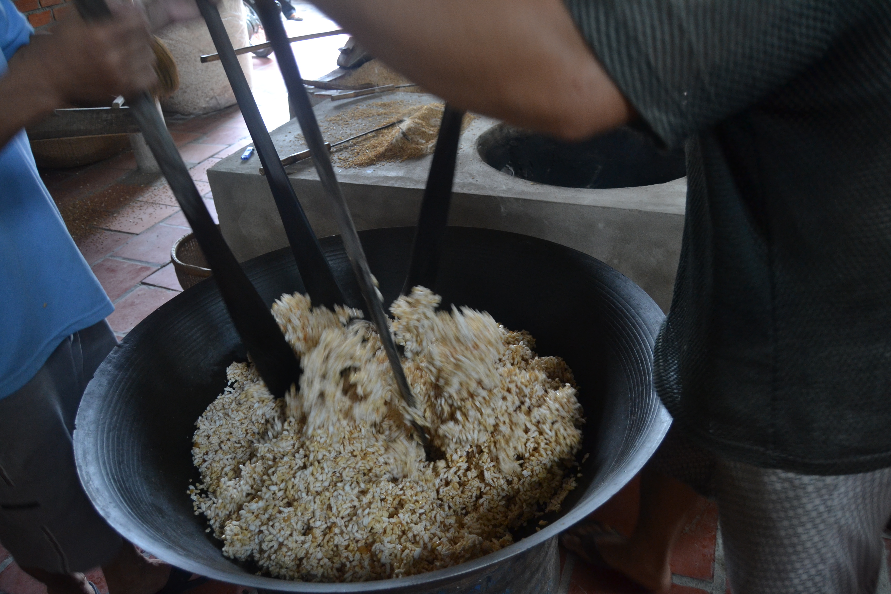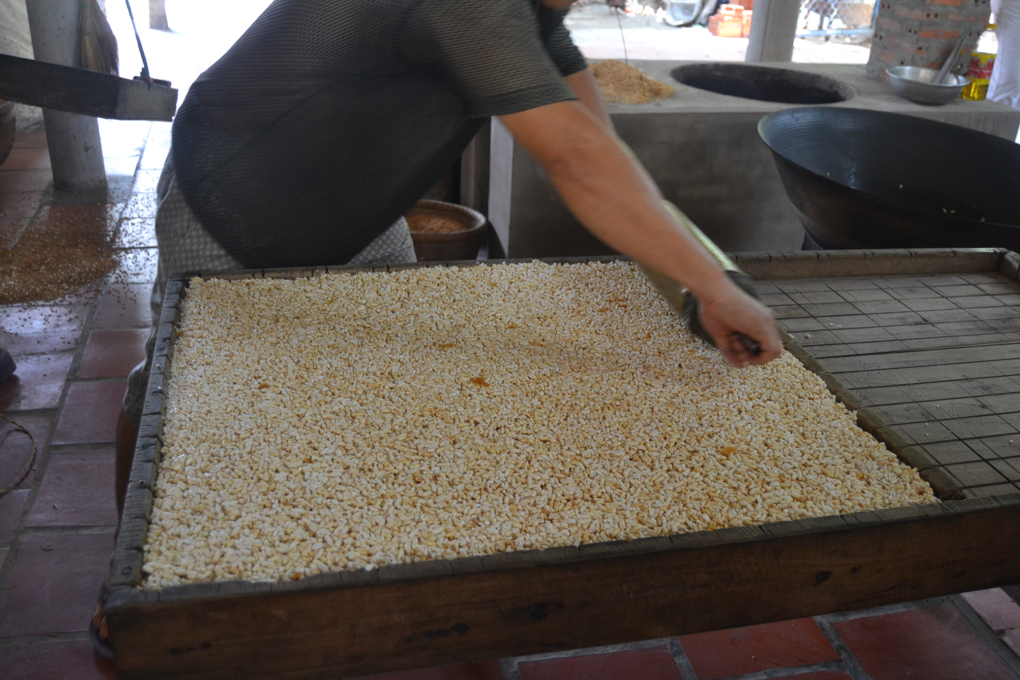 We stopped at this house where this woman was making sesame pancakes. I love the heart drawn on the wall behind her. At the same location there was what appeared to be a mini rice krispie factory and we got to help (or get in their way).