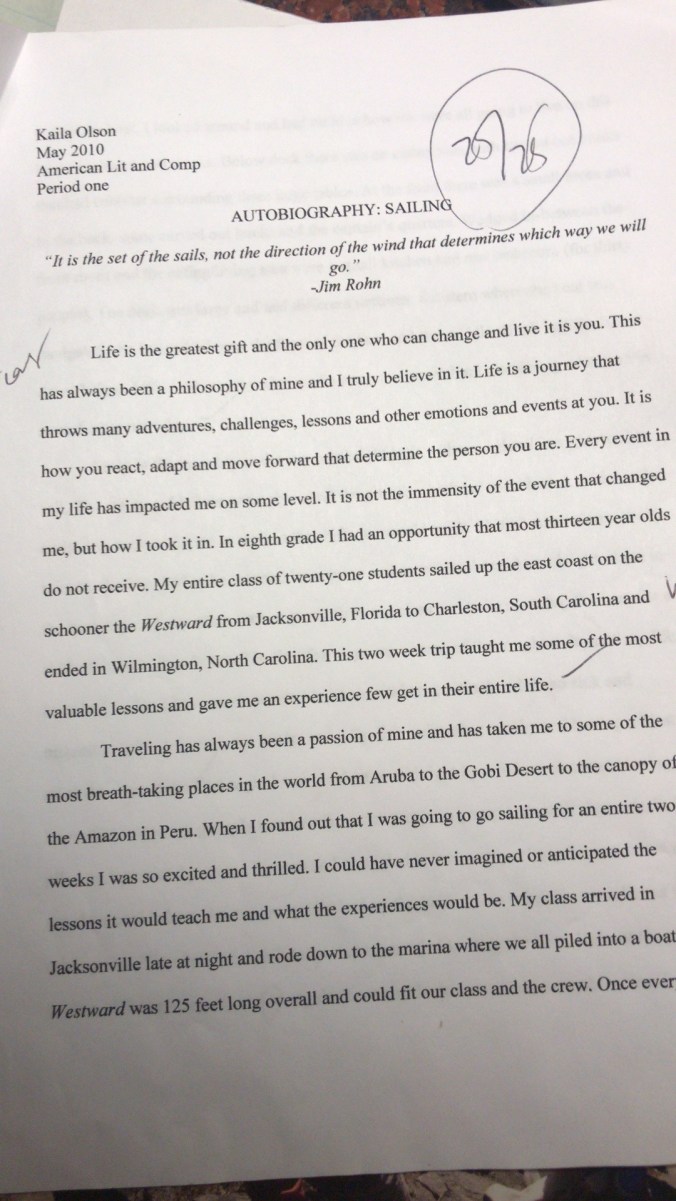 “Life is the greatest gift and the only one who can change and live it is you. This has always been a philosophy of mine and I truly believe it. Life is a journey that throws many adventures, challenges and lessons and other emotions and events at you. It is how you react, adapt and move forward that determines the person you are. The smallest moments in my life have often made the largest impacts on my philosophy and who I am…I also believe and know that my actions each day define who I am, the person I am the next day and forever on. Life is going to get rocky and tough, but if you sail through it win a fearless attitude and supportive people, the water will eventually calm and become clear.