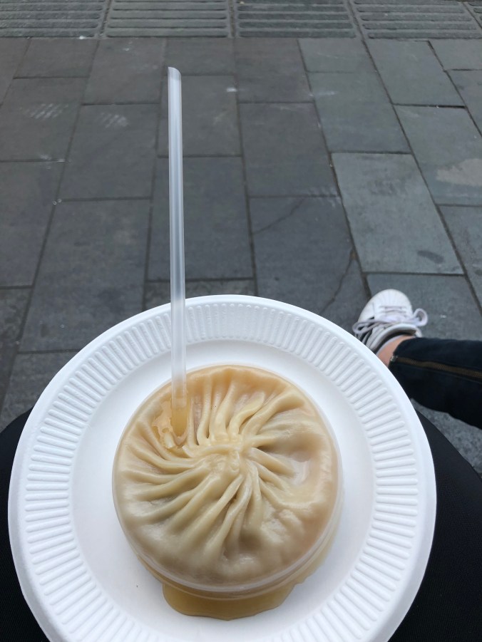 A huge crab and pork soup dumpling! So big you have to use a straw.