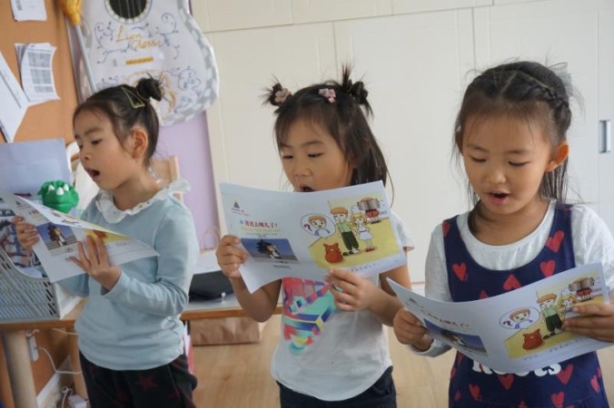 Reading their weekly Chinese story.